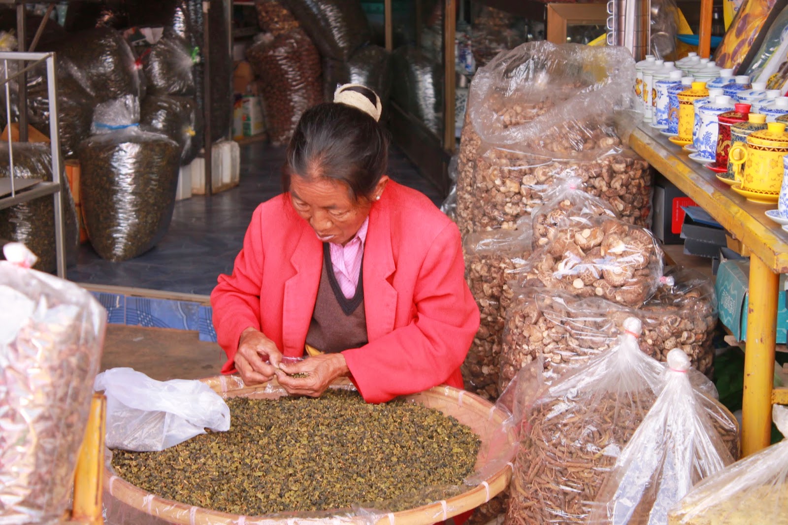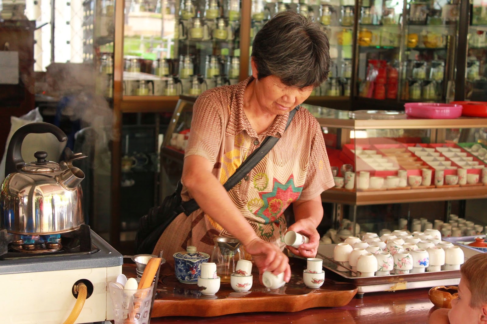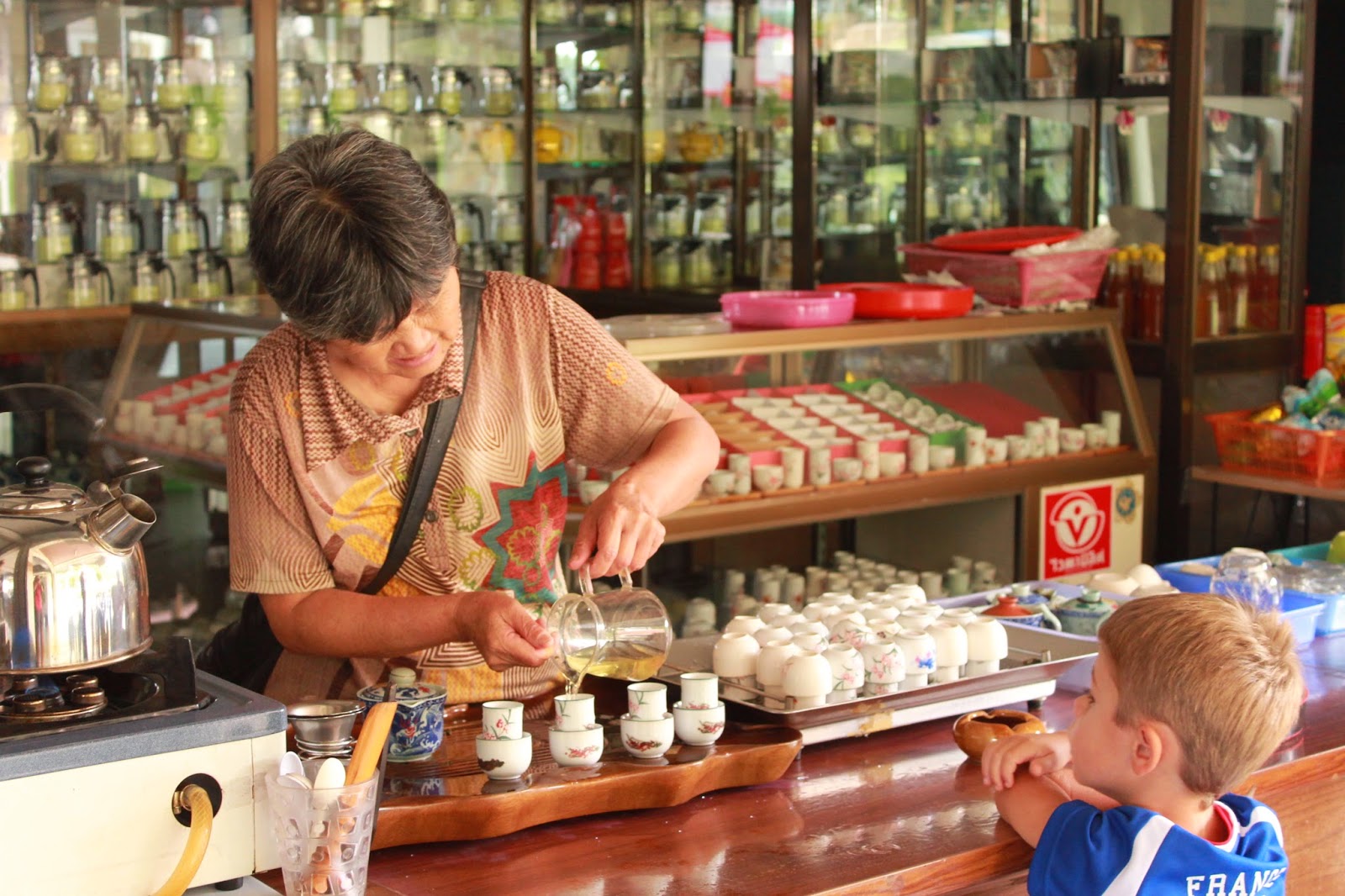 Mae Salong, étant un village où l’on produit du thé, nous nous arrêtons pour une dégustation. Je crois d’ailleurs, que c’est bon pour moi, j’ai fait une overdose de thé. Cédric m’ayant lâchement abandonné au bout de 2 verres, j’ai du gouté seule tous les autres thés…. C’est sure qu’après ça je n’ai plus du tout eu soif! j’ai gouté du thé vert, qui n’avait rien à voir avec le thé qu’on a l’habitude de boire! Mon préféré a été celui au jasmin. La dégustation se fait selon un rituel, qui consiste à verser le l’eau dans des petites tasses, puis à les retourner rapidement. Bien évidement les tasses sont brulantes, ce qui n’avait pas l’air de gêner notre hôte.