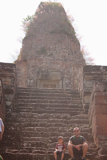 Il faut bien l’avouer n’étant pas des passionnés d’histoire, ni de vieilles pierres, nous ne souhaitions pas passer la journée à simplement visiter des temples. Nous avons donc décider de nous rendre toujours avec notre Tuk Tuk attitré, voir les temples du groupe Roluos, qui sont à une quinzaine de km de Siem Reap mais pas sur le site d’Angkor ( ils font néanmoins partis du pass). Nous visitons le temple du Preah Ko qui est très beau. Encore une fois nous sommes entourés que de très peu de monde. Nous remarquons que les enfants des personnes qui travaillent sur le site, sont présents avec elles. Cette fois nous avons pensé à prendre un gros paquet de bombons!