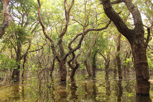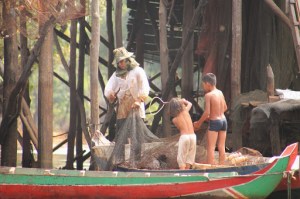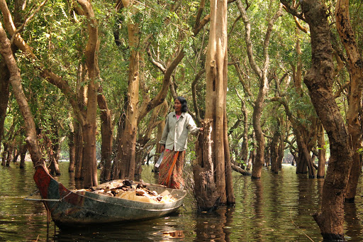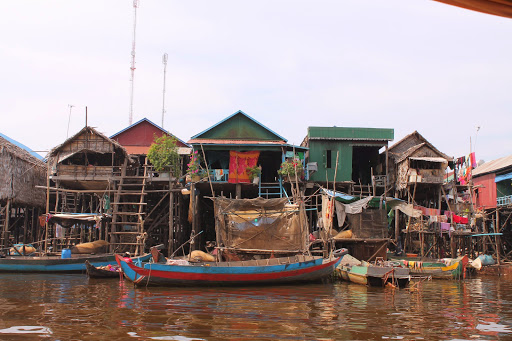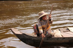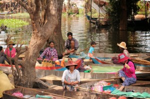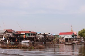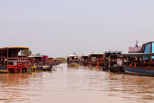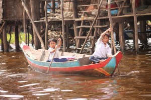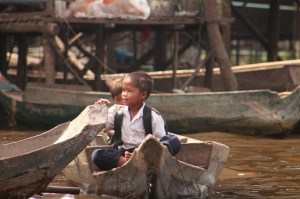 Arrivés entier, nous embarquons tous les trois dans un petit bateau à moteur. Après 1/4 d’heure de navigation au milieu de rien, nous découvrons Le village, entièrement sur pilotis. Une vrai merveille. Le village vit de la pêche, les enfants ont une grande école, où ils se rendent en pirogue. Nous voyons des enfants de l’âge d’adrien se déplacer tout seul sur leur bateau. Nous voyons des gens se laver dans l’eau du lac au savon, sur ou à coter de leur bateau. Nous sommes vraiment ici dans un autre monde et nous vivons un moment inoubliable. Nous descendons du bateau pour monter dans une pirogue (5dollars, en plus par personne gratuit pour Adrien), qui nous fait rentrer dans le village où se baignent les enfants. Nous leur donnons des bombons, ils sont super contents. Nous évoluons avec notre pirogue à travers une forêt immergée. De retour sur le bateau, nous naviguons jusqu’à l’immense lac Tonle Sap. Nous faisons le chemin inverse pour retrouver notre TUk TUk tout terrain qui nous ramènera entier à l’hôtel.