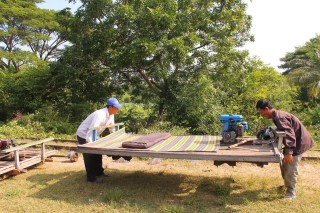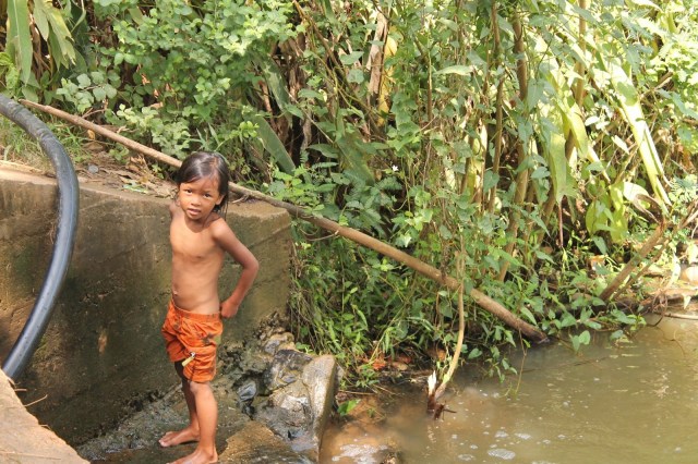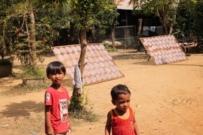 Notre premièr arrêt se fera au Bambou Train, l’attraction de la région. (Nous avions hésité à le faire mais Adrien avait l’air très emballé!) Ce n’est pas un vrai train mais une plateforme en bambou posée sur 2 essieux qui avance sur un chemin de fer. Il traverse de jolies rizières et nous fait arriver en une 20aine de minute à une usine de briquettes où nous sommes accueillis par des marchandes de souvenirs et plein d’enfant. La dame du stand qui nous accueille est d’une gentillesse incroyable. Nous lui achetons 2 bracelets et elle en offre un de plus à Adrien. Elle nous parle d’elle et de ses enfants. Nous distribuons quelques bombons et nous nous dirigeons vers l’usine de briquettes suivi par tous les enfants du village. L’un d’eux, un jeune homme de 12 ans, parle déjà très bien anglais, ils nous fait visiter l’usine avec une autre dame adorable. Nous continuons la distribution de bombons et tous les enfants viennent vers nous. On a passé un très bons moment avec eux, ils étaient tous tellement contents de recevoir quelques bombons.