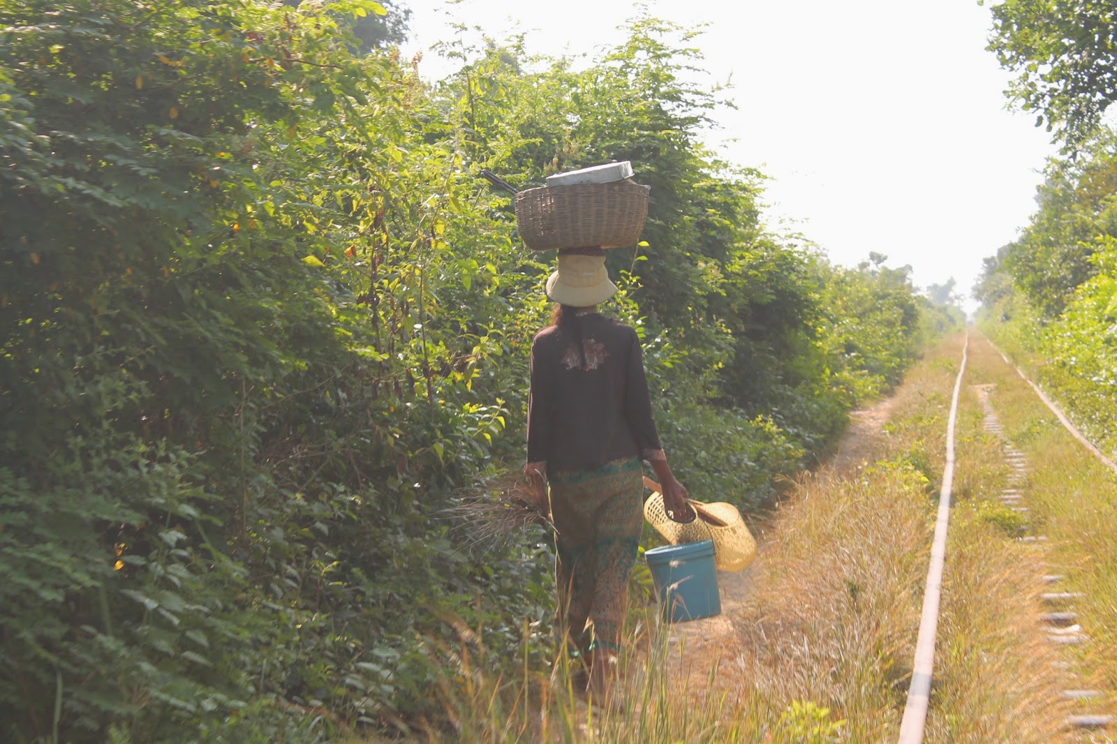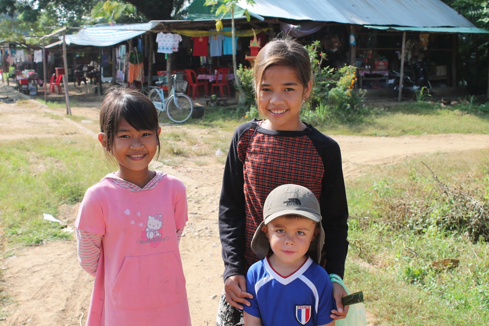 Notre premièr arrêt se fera au Bambou Train, l’attraction de la région. (Nous avions hésité à le faire mais Adrien avait l’air très emballé!) Ce n’est pas un vrai train mais une plateforme en bambou posée sur 2 essieux qui avance sur un chemin de fer. Il traverse de jolies rizières et nous fait arriver en une 20aine de minute à une usine de briquettes où nous sommes accueillis par des marchandes de souvenirs et plein d’enfant. La dame du stand qui nous accueille est d’une gentillesse incroyable. Nous lui achetons 2 bracelets et elle en offre un de plus à Adrien. Elle nous parle d’elle et de ses enfants. Nous distribuons quelques bombons et nous nous dirigeons vers l’usine de briquettes suivi par tous les enfants du village. L’un d’eux, un jeune homme de 12 ans, parle déjà très bien anglais, ils nous fait visiter l’usine avec une autre dame adorable. Nous continuons la distribution de bombons et tous les enfants viennent vers nous. On a passé un très bons moment avec eux, ils étaient tous tellement contents de recevoir quelques bombons.