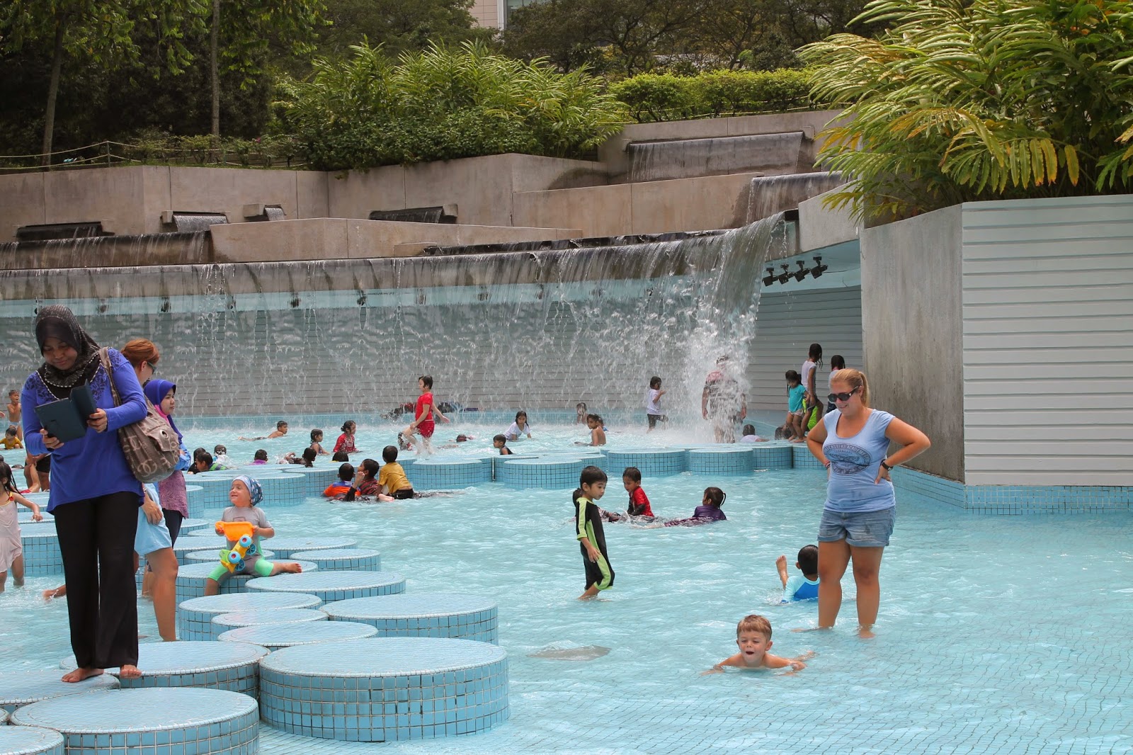 Arrivés devant les tours, on a fait comme tout le monde, un maximum de photo….Au pied des tours, il y a un immense magasin luxueux,le Suria Klcc, regroupant toutes les marques existantes de Prada à Vuitton, en passant par Guess (et là, ça a été très dure pour moi de ne pas craquer, car en plus le magasin affichait des soldes à -50%!!!! Et bien je n’ai pas craqué et je ne suis pas rentré dans la boutique!!!!), mais aussi de grandes chaînes anglaises comme Mark and Spencer ou Harrods. Nous avons traversé ce magnifique mall décoré à merveille pour Noël, pour arriver dans un magnifique parc. Adrien s’y est beaucoup amusé. Il s’est baigné dans des piscines et a pu se défouler dans le children Playground, une immense aire de jeux, au pied des tours.