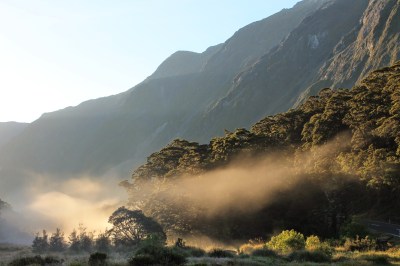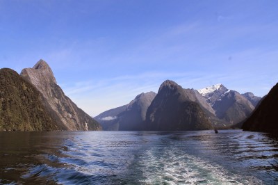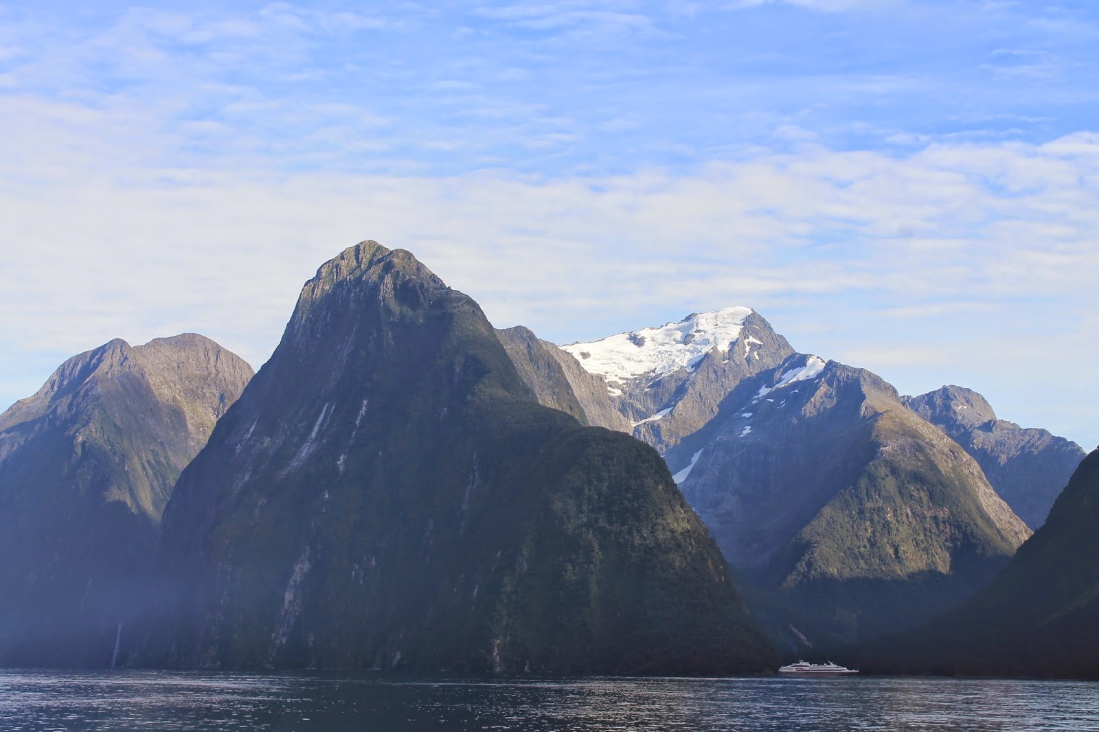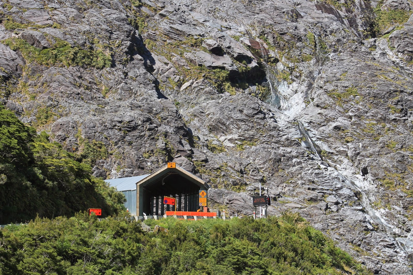 Pour aujourd’hui, nous avons réservé une croisière dans le fjord de Milford Sound. Nous sommes passés par le site internet Bookme.co.nz. Nous avons réservé la croisière de 1h30 de Juicy, pour 45 dollars par adulte et 15 par enfant, départ à 9h15. Comme nous ne savons pas exactement combien de temps va prendre la fin du trajet jusqu’à Milford Sound, nous décidons de partir à 7h du lac Gunn. Finalement nous aurons bien fait. Nous pouvons nous arrêter tranquillement sur la route, car il n’y a pas grand monde, pour admirer le paysage de plus en plus beau. Le jour se levant, nous pouvons faire de très belles photos. Petite anecdote: pour atteindre Milford Sound, il faut traverser une montagne par un tunnel de 1,2 km de long et d’une seule voie.