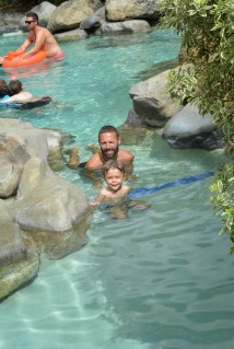 Nous payons l’entrée du centre aquatique 22dollars par adulte et 11 pour Adrien. Il y a plusieurs bassins d’eau thermal de 40° à 33° dans un joli cadre qui fait naturel. Il y a également des bassins de balnéothérapie. Pour les familles, il y a un grand bassin chauffé où les enfants et les parents peuvent se baigner. Il y a même une aire de jeux aquatiques bordée de pelouse avec des transats et tables de pic nique. Enfin, pour les nageurs, il y a une piscine de nage. Côté plus fun, il y a deux grands toboggans et un toboggan à bouée. On trouve aussi un spa et des bassins à privatiser, (30 dollars tout de même la demi heure!). Pour faire du toboggan avec la bouée, il y a un supplément à payer à l’entrée.