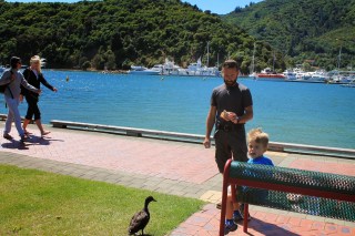 Picton est une charmante petite ville, qui voit arriver chaque jour en été des hordes de touristes débarquant de l’île du Nord, où venant pour embarquer. Nous y passons la matinée, moi à me promener dans les boutiques de souvenirs, toutes hors de prix, et Adrien à jouer dans une grande aire de jeux sous l’œil attentif de son papa. Nous prenons notre déjeuner au bord de l’eau, vue sur la baie. Après le repas, nous nous laissons tenté par une glace, un peu spéciale, faite à base de fruits frais mixés, un vrai délice!