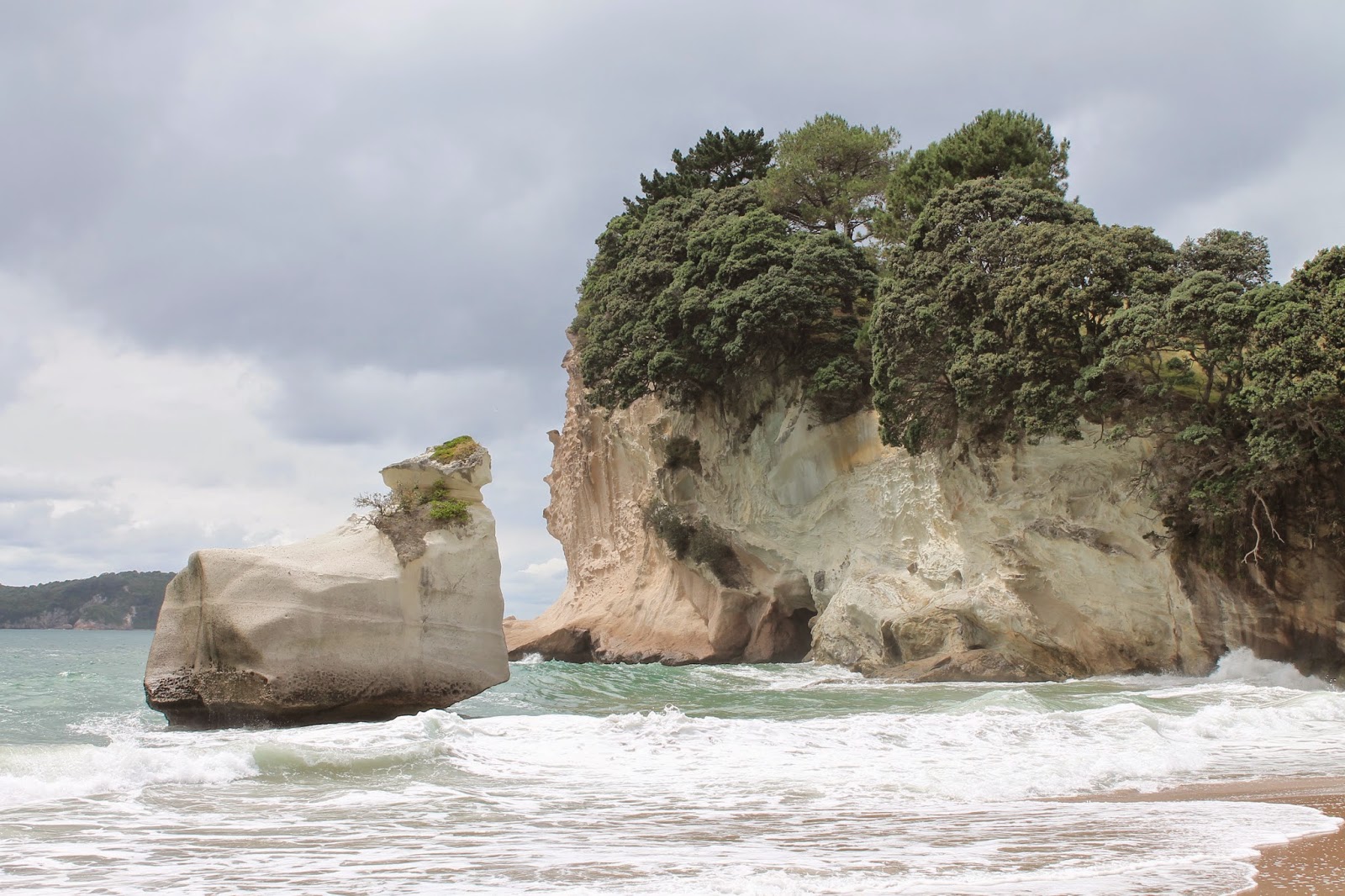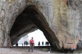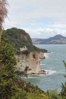 Au réveil, le temps n’est toujours pas terrible mais nous avons prévu de nous rendre à Cathédrale Cove. Nous retrouvons sur le parking nos amis allemands et décidons de faire le chemin ensemble. Pour ce rendre à Cathedral Cove, il y a environ 45 minutes de marche sur un très joli sentier où nous retrouvons les odeurs et les sons de la Méditerranée. Nous pourrions penser que nous sommes dans la Pinède. Nous arrivons sur la fameuse plage et découvrons le fameux arche que reconnaîtrons les cinéphiles. En effet la plage est celle du film le monde de Narnia.