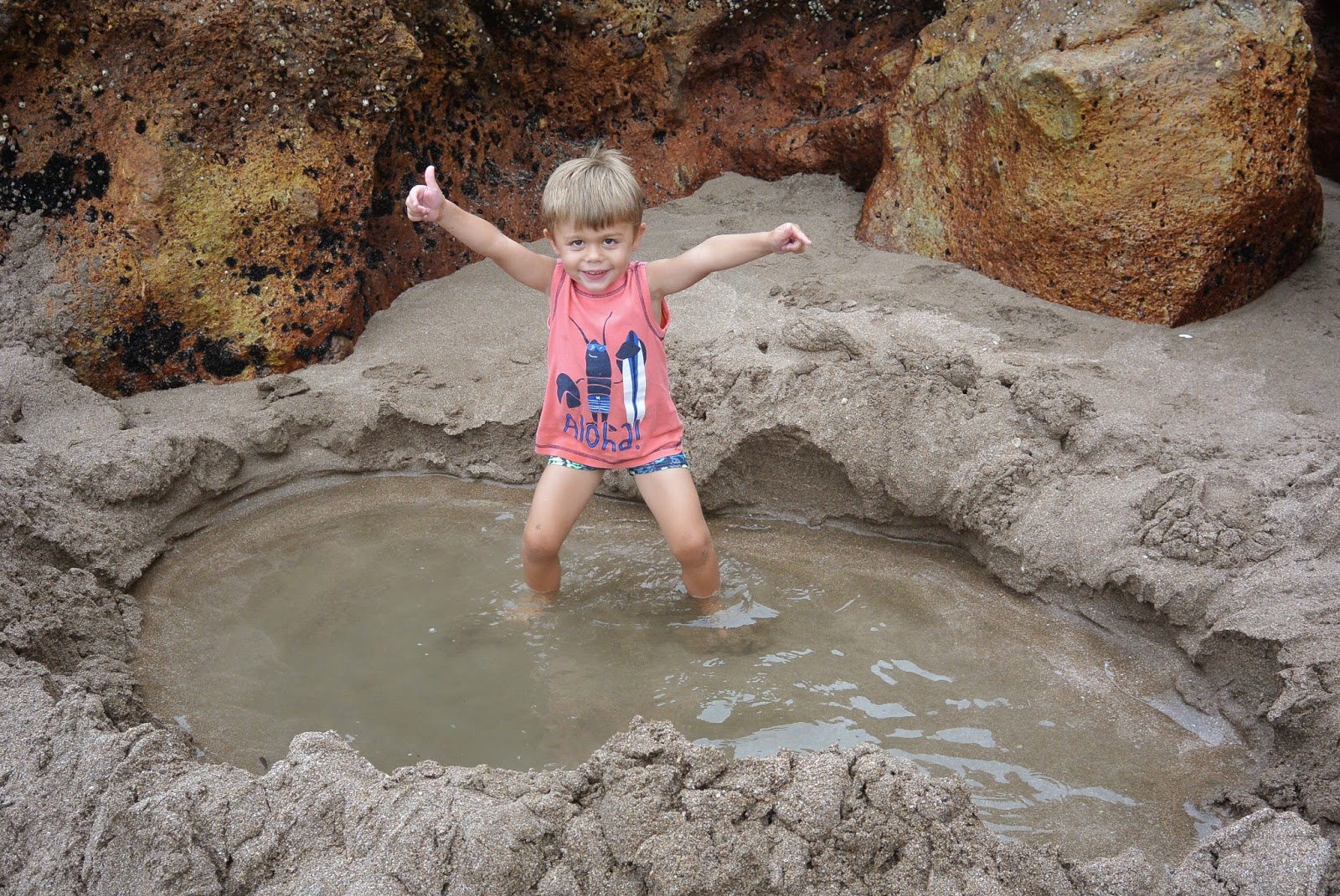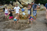 Juste à côté de nous, est garée une famille allemande, avec un petit garçon de l’âge d’Adrien. Adrien s’amuse tout l’après midi avec lui et nous sympathisons avec ses parents. Nous décidons donc de partir ensemble sur la plage. Malheureusement le temps n’est pas terrible et il y a énormément de vague. A 19h nous creusons ensemble mais il y a tellement de monde que les points stratégiques sont tous pris. Nous ne trouverons donc pas d’eau chaude ce soir! Mais certains oui, alors nous squattons le trou des autres! Après cette soirée bien sympa en compagnie de nos amis allemands nous allons nous coucher car demain nous avons un programme chargé!