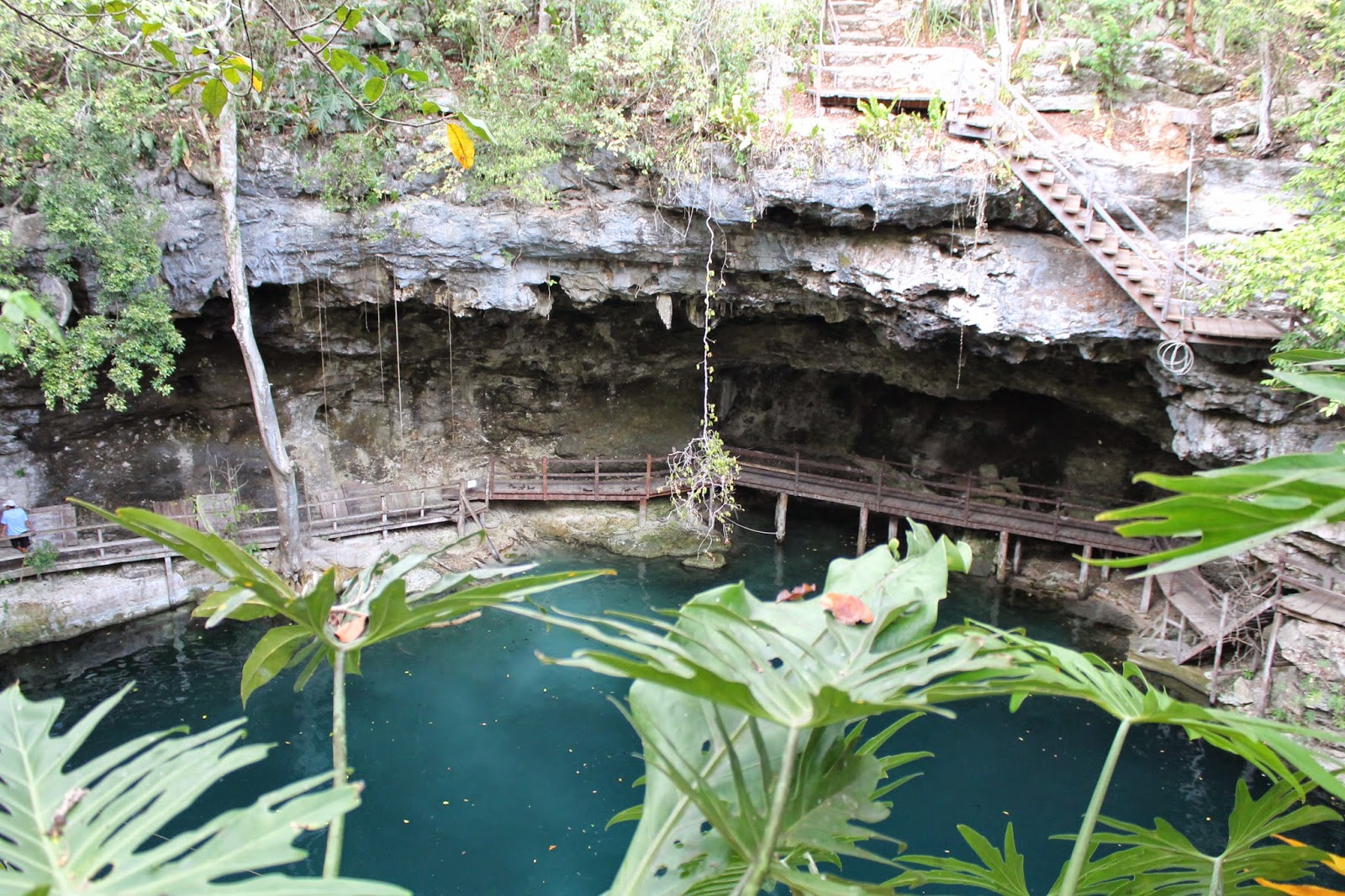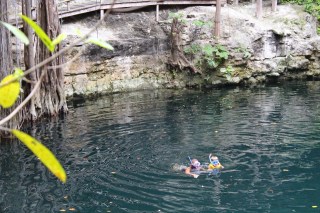 Après cette promenade fascinante au milieu des ruines, nous nous rendons à la cénote X ‘Canche, également accessible depuis le site. Nous payons 30 pesos par personne. Pour accéder au cenote, on peut soit marcher, soit louer des vélos, soit prendre un genre de tuc tuc. Le chemin fait 2 km. Devinez ce que nous choisissons??? Bien sûre la marche!!!!!
