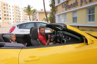 L’agent trouve notre réservation et commence à nous proposer un tas d’option dont l’assurance supplémentaire, le plein d’essence etc… Voyant nos sacs à dos, il nous affirme que la cabriolé que nous avons réservé n’a pas le coffre assez grand pour nos bagages. Ils nous proposent pour 17 euros de plus par jour le modèle luxe, nous vendant « La » Camaro jaune! Du coup, on accepte! L’appel de la Camaro a été plus fort que la raison et Adrien est tellement content.
