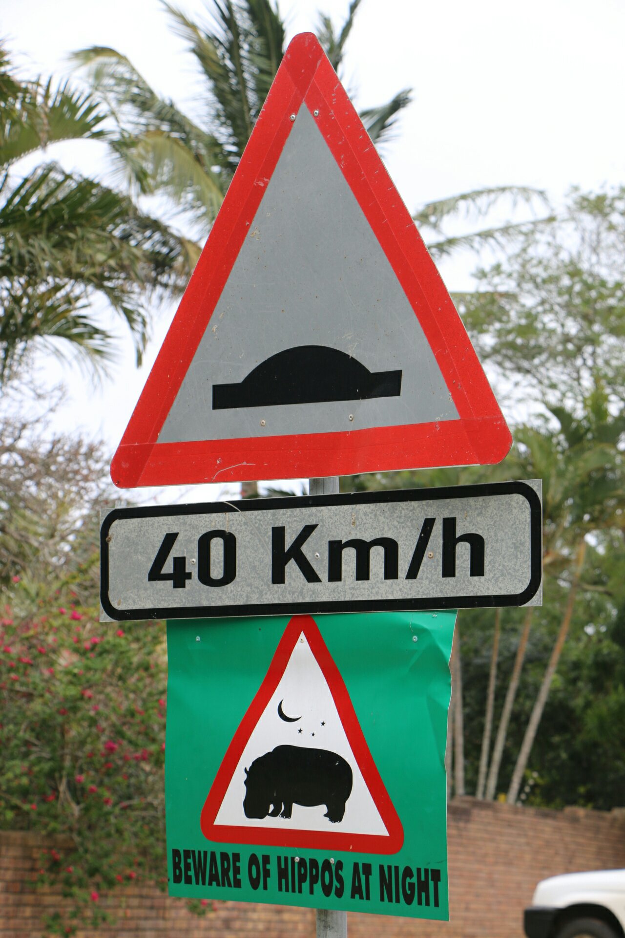 Mais St. Lucia ne compte pas que des touristes, elle est aussi habité par des hippopotames, qui comme l’indiquent les panneaux présents un peu partout, s’approprient la ville la nuit.