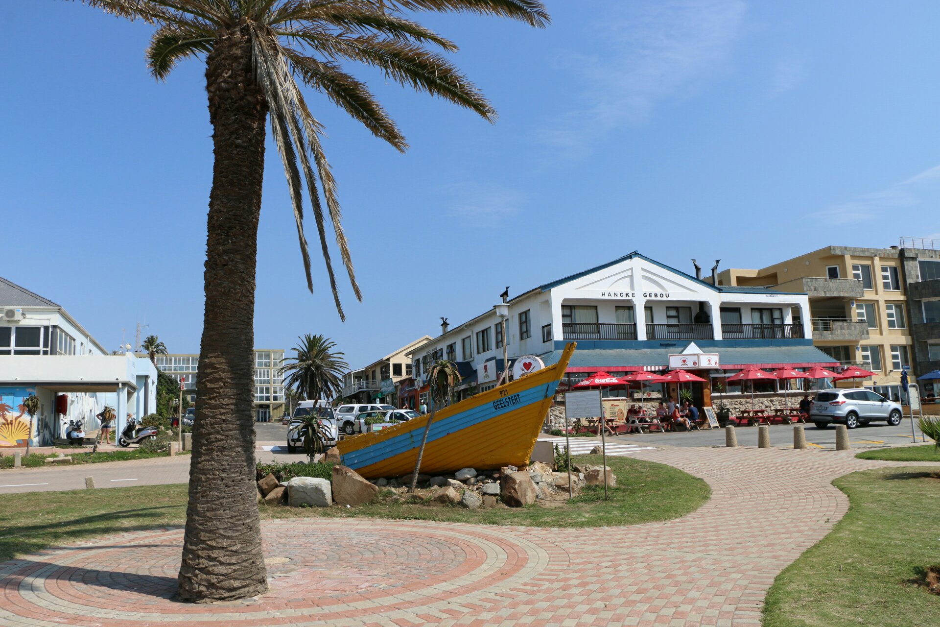 Nous ne nous attardons pas plus que ça et filons vers Francis Bay, petite ville en bord de mer, très huppée. Encore une fois après avoir passé tout un quartier de bidonville, nous découvrons de superbes maisons, dont la particularité est d’avoir pour la plupart un toit de chaume. Nous sommes le 3 octobre et c’est notre anniversaire de mariage. Nous mangeons dans un petit restaurant de délicieux calmars dont la pêche est la spécialité du coin. Repus, nous reprenons notre route et rejoignons Knysna, afin de faire une étape pour la nuit.