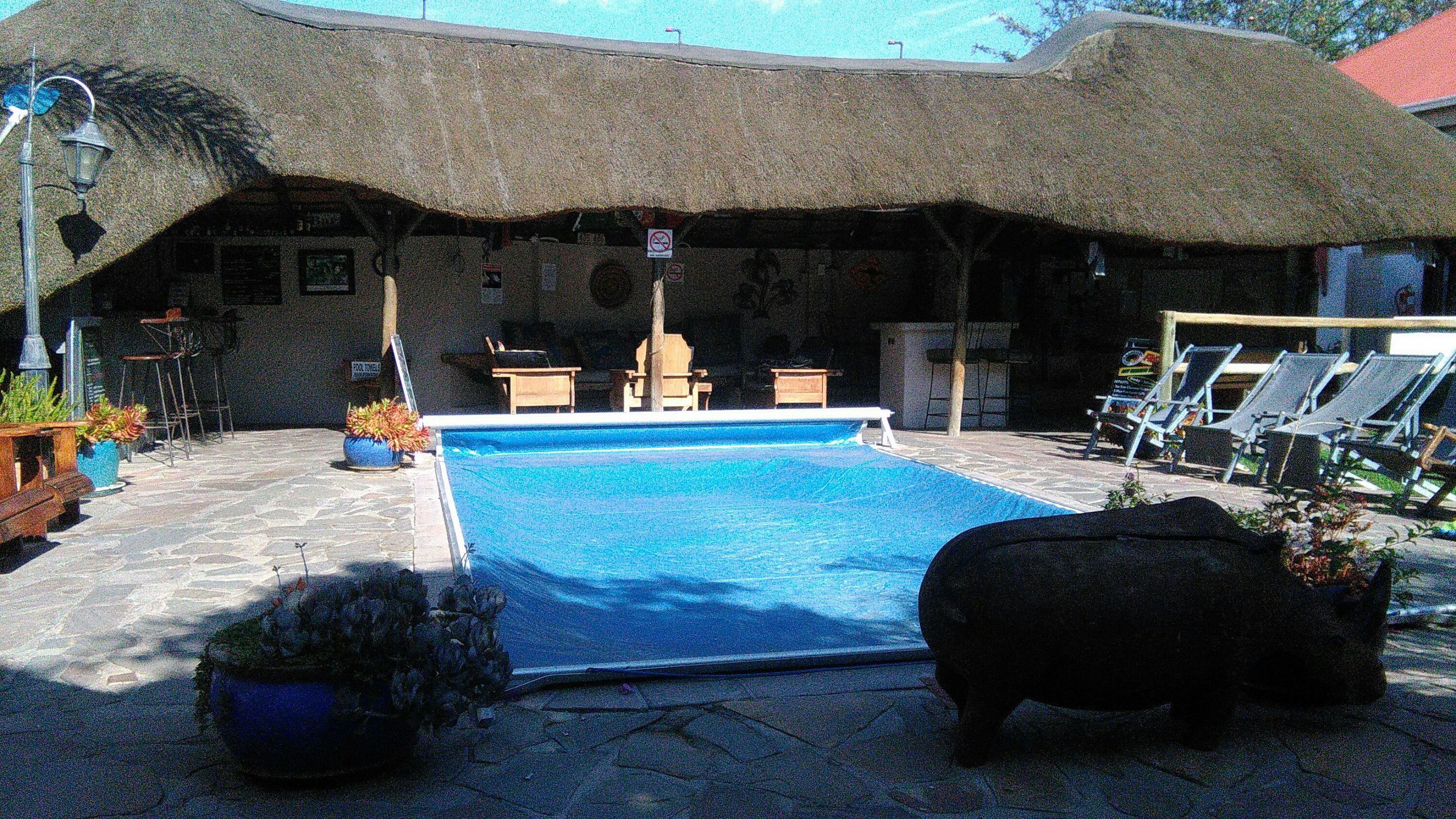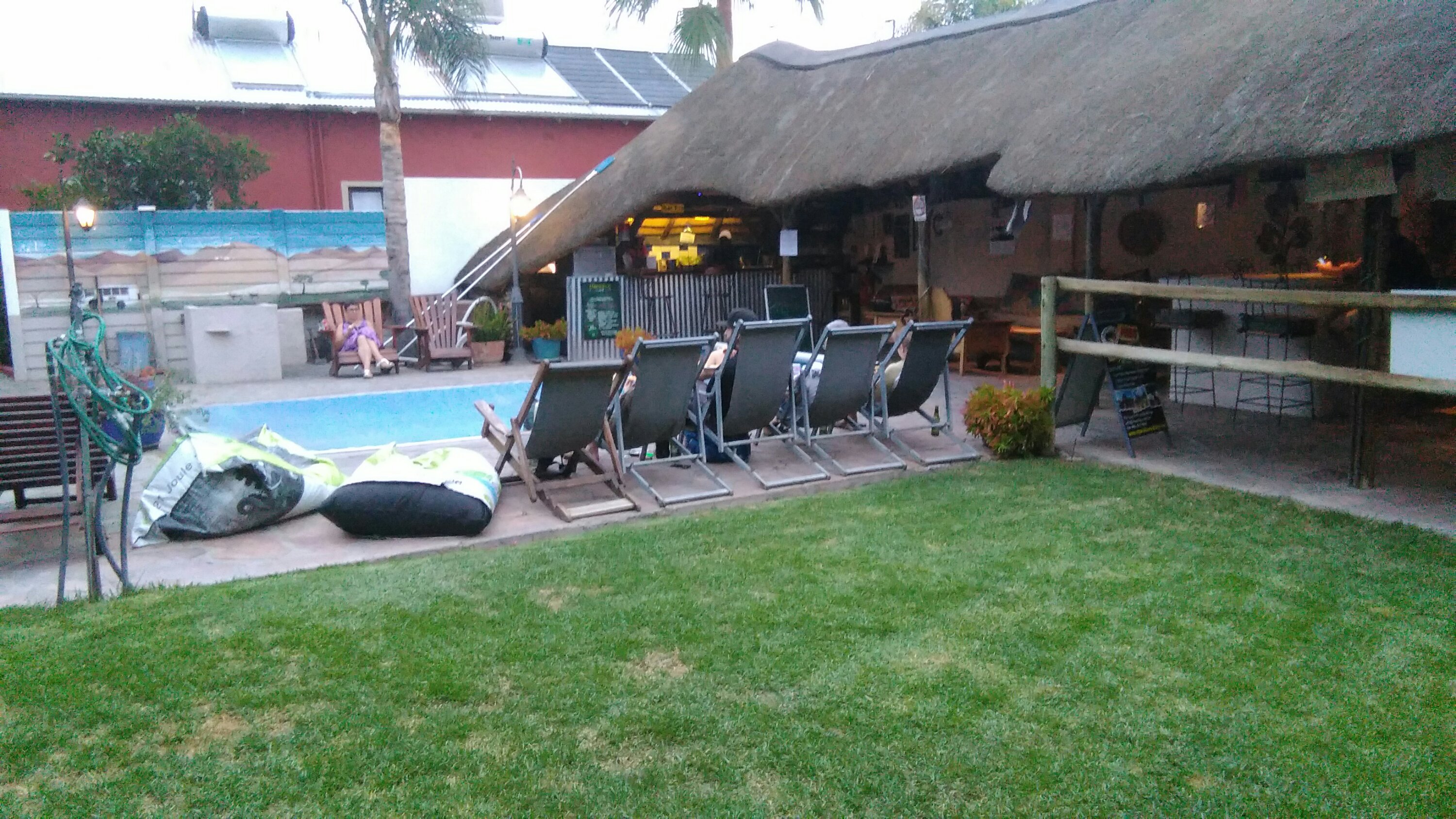 Nous avons choisi une auberge de jeunesse à priori très populaire, le Chameleon Backpackers, où nous avons élu domicile dans une grande chambre familiale. L’endroit est sympa et animé. Le plus de cette auberge est qu’elle propose également de nombreux tours en Namibie. Chaque soir pour le dîner, un plat différent y est proposé pour 80 dollars namibien par personne. Le petit déjeuner est compris. Il y a une belle piscine que nous n’avons pas vu une seule fois débachėe, (dommage! ) et le wifi marche bien. Pour faire nettoyer son linge, un grand panier coûte 50 dollars namibiens.