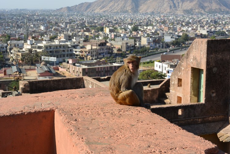 Pour nous déplacer, nous avons pris un rickshaw, qui nous a conduit de place en place. Nous avons d’abord découvert le City palace à l’intérieur des remparts de la ville rose, ainsi que le Jantar Mantar. Puis nous nous sommes rendus à l’incontournable Palais des Vents, pour en prendre une photo. La visite s’est ensuite poursuivie en dehors des remparts de la ville au temple des singes. Une visite, hors des sentiers battues et au calme, au milieu des singes. Bon le lieu n’a rien d’exceptionnel car il est en plus assez sale, mais il offre une belle vue sur la ville. Enfin, nous nous sommes rendus au Jal Mahal, le palais flottant, afin de faire la photo incontournable de la ville.