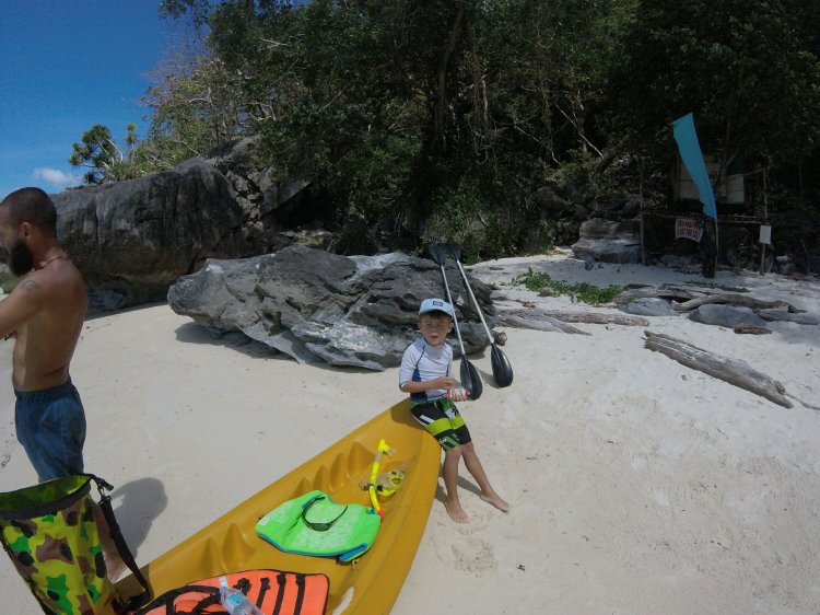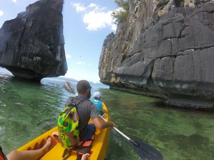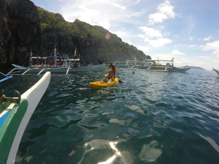 Louer un kayak est le moyen économique pour découvrir tranquillement la baie, loin de tous les autres touristes. On peut en louer sur toutes les plages. Nous en avons loué un, pour 400 pesos sur la plage de Corong Corong. Nous avons ainsi pu découvrir de jolies plages désertes et surplombées par des pics rocheux. Nous avons pu également découvrir de très jolis fonds en snorkeling, certainement les plus beaux que nous ayons vu!