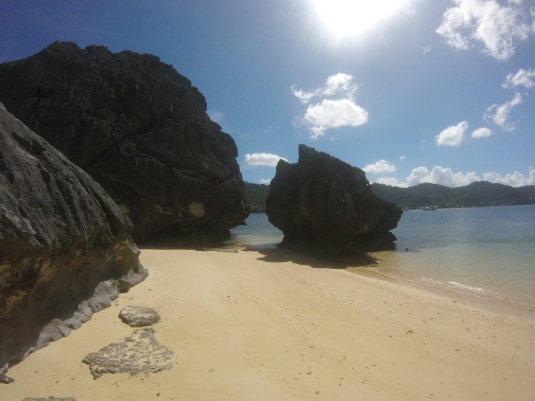 Une plage cachée au milieu de pics rocheux. On y accède à la nage. On peut y faire un joli snorkeling. Cédric a même croisé un requin pointe noire!