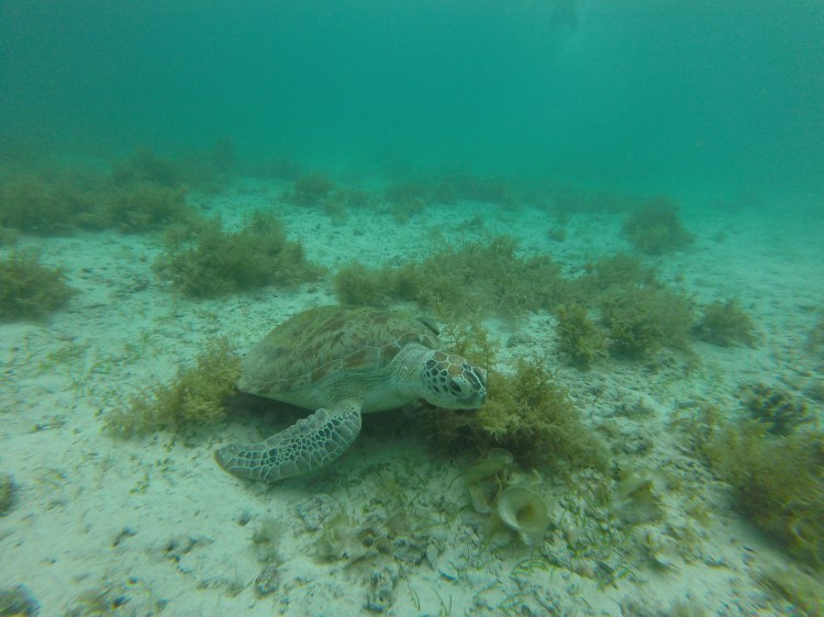 Puis nous accostons sur une plage paradisiaque German Island. Depuis la plage, nous avons pu nager avec de belles tortues. Après le snorkeling et la détente, nous prenons notre repas cuisiné par notre capitaine: poissons grillés, riz, concombres et tomates.