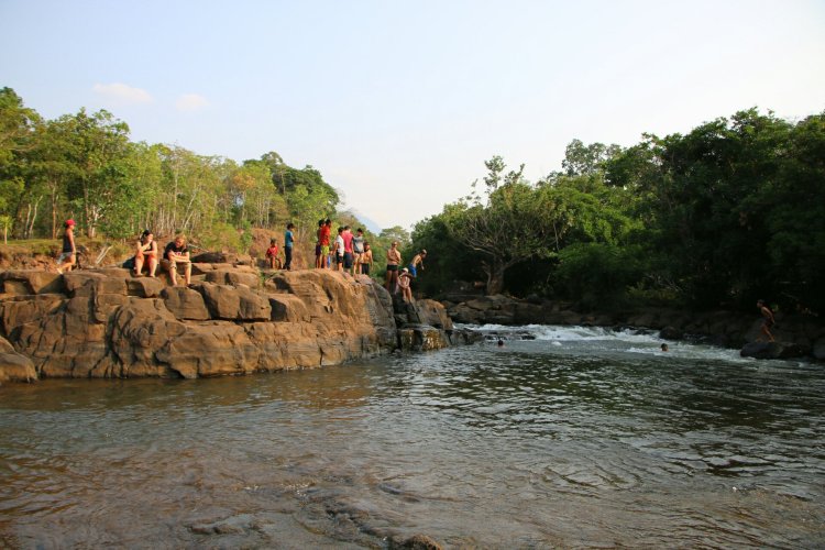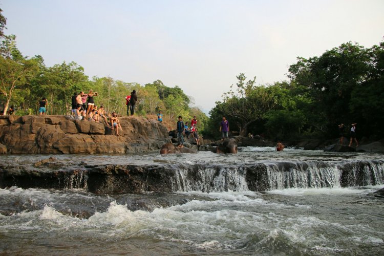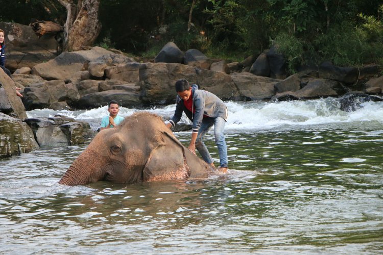 Le Tadlo lodge qui possède deux éléphants, les emmène tous les jours à 7h et 16h30 prendre leur bain dans la cascade. Un spectacle dont on ne se lasse pas.