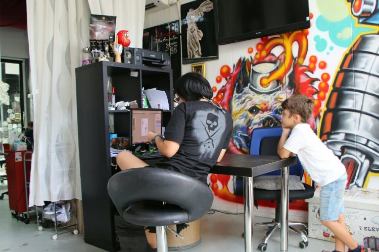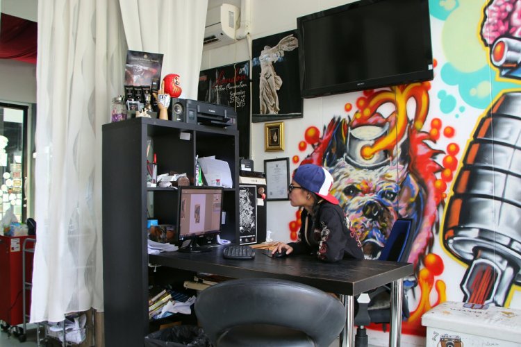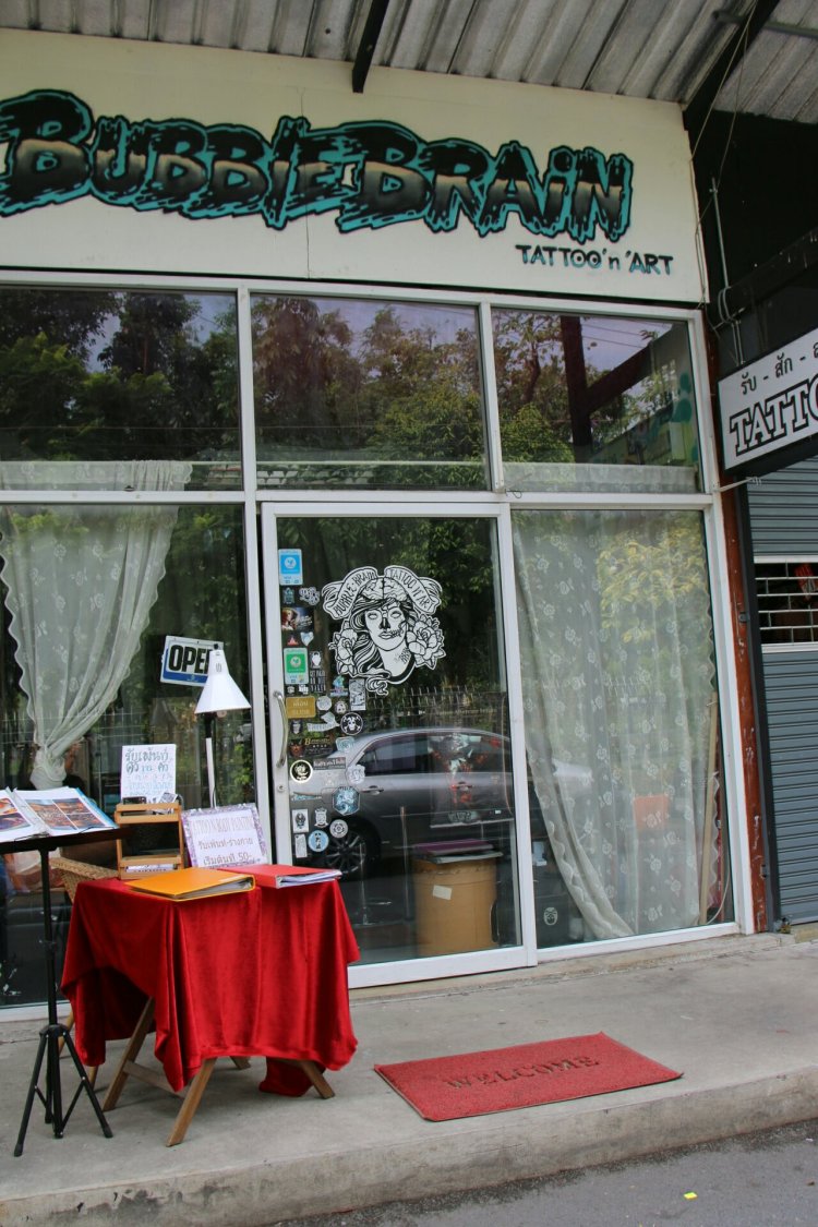 Après avoir sonder quelques salons à Khao San Road, qui nous annonçaient des prix rocambolesques, nous pensions abandonner l’idée de nous faire de nouveaux tatouages. Puis nous avons vu qu’il y avait une tatoueuse à Chatuchak, assez populaire.