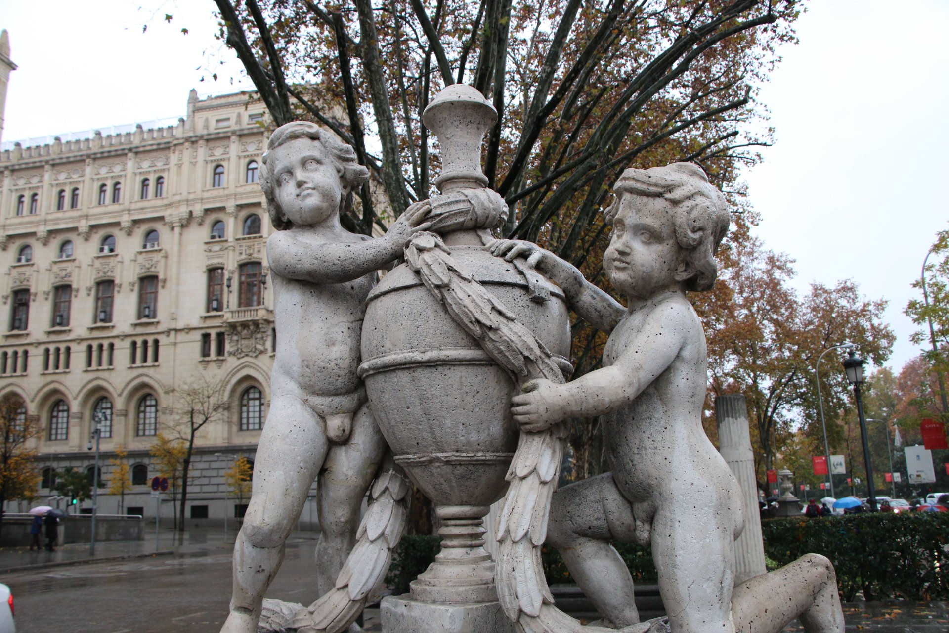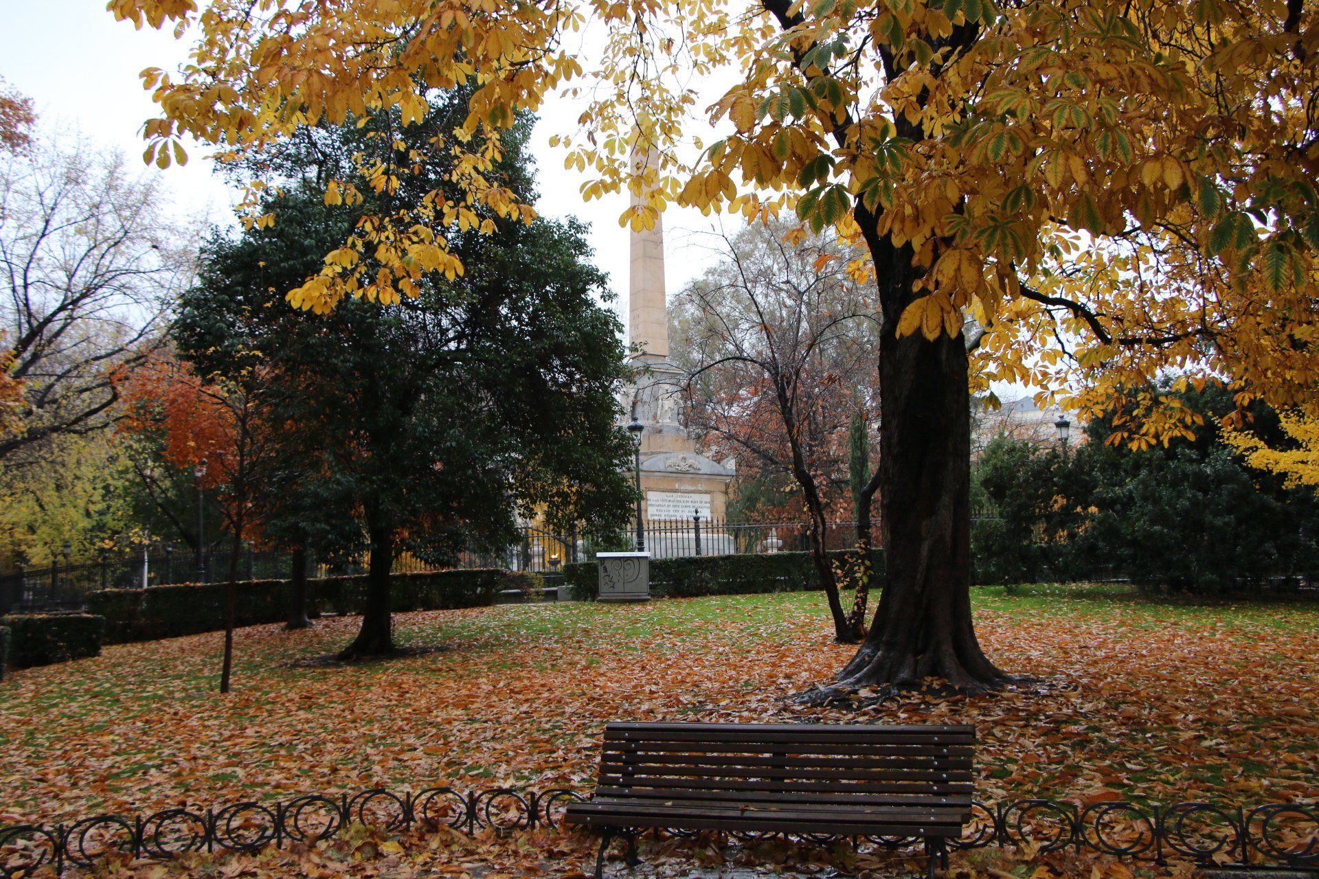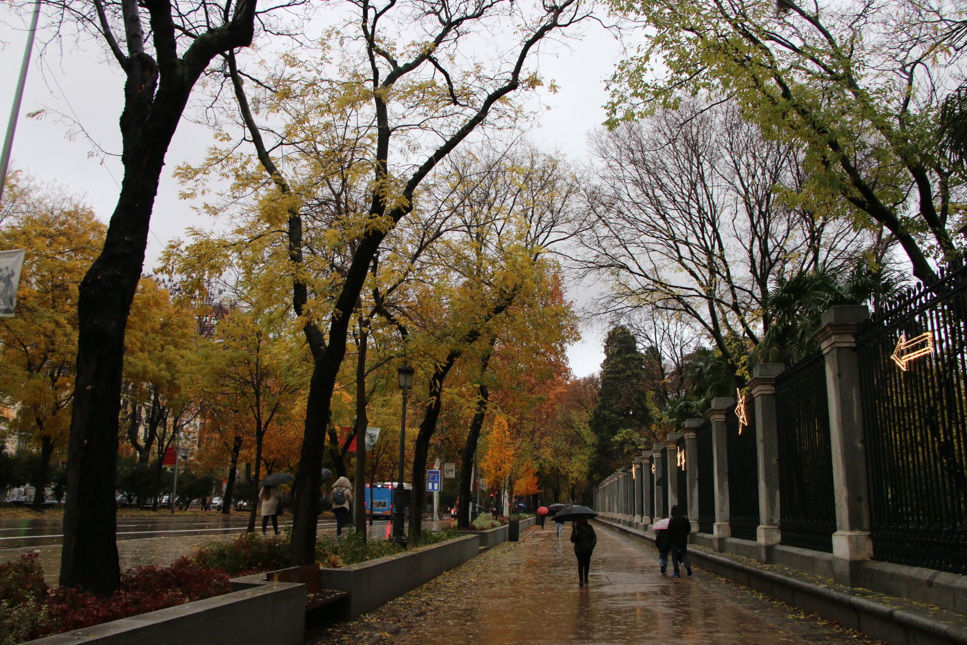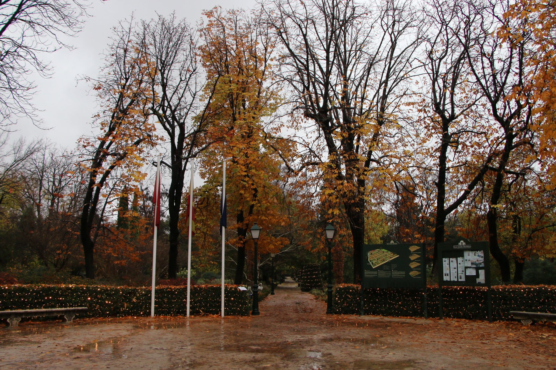 Nous continuons notre ballade en remontant le Passeo del Prado, dont les splendides couleurs d’automne ressortent d’avantage avec la pluie. Nous sommes trempés, mais le décors est tellement sublime que nous essayons de visiter le jardin botanique. Malheureusement, le jardin ferme pour la fin de journée car il n’est plus praticable à cause de la boue.
