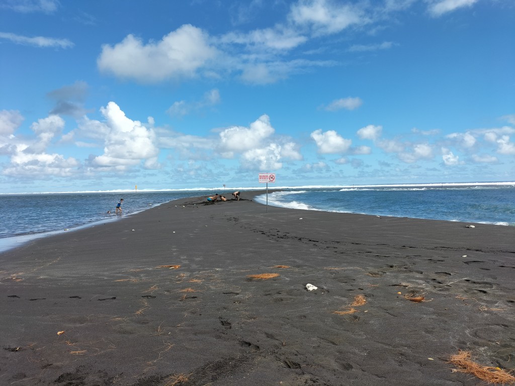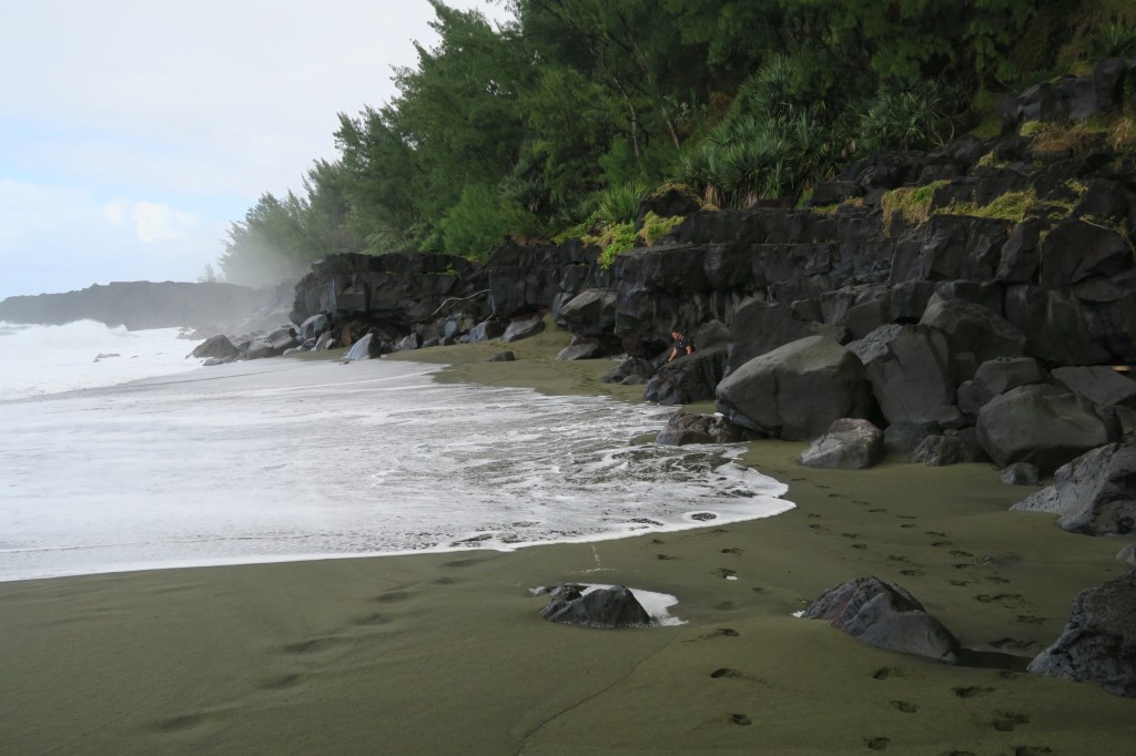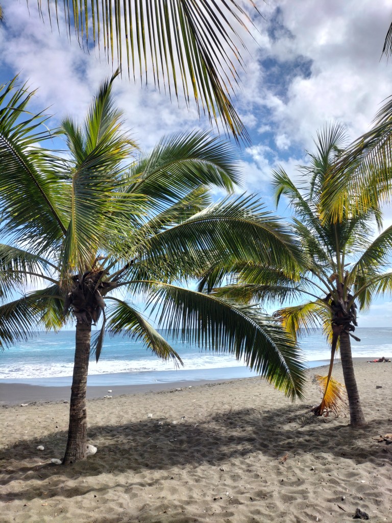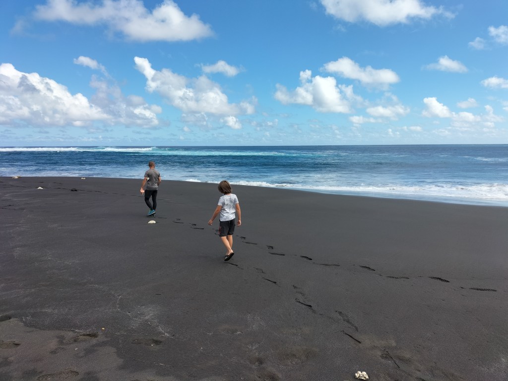 Après 2 nuits au Jardin Créole, nous reprenons la route de Cilaos pour rejoindre la côte et la plage D’étang Salé, célèbre pour son sable noir et bordé de cocotiers. La station balnéaire est agréable et il y a un beau marché. L’ambiance est plutôt baba cool. Il y a un filet de protection pour la baignade mais l’océan étant assez agité, ça ne donne pas envie de se baigner.